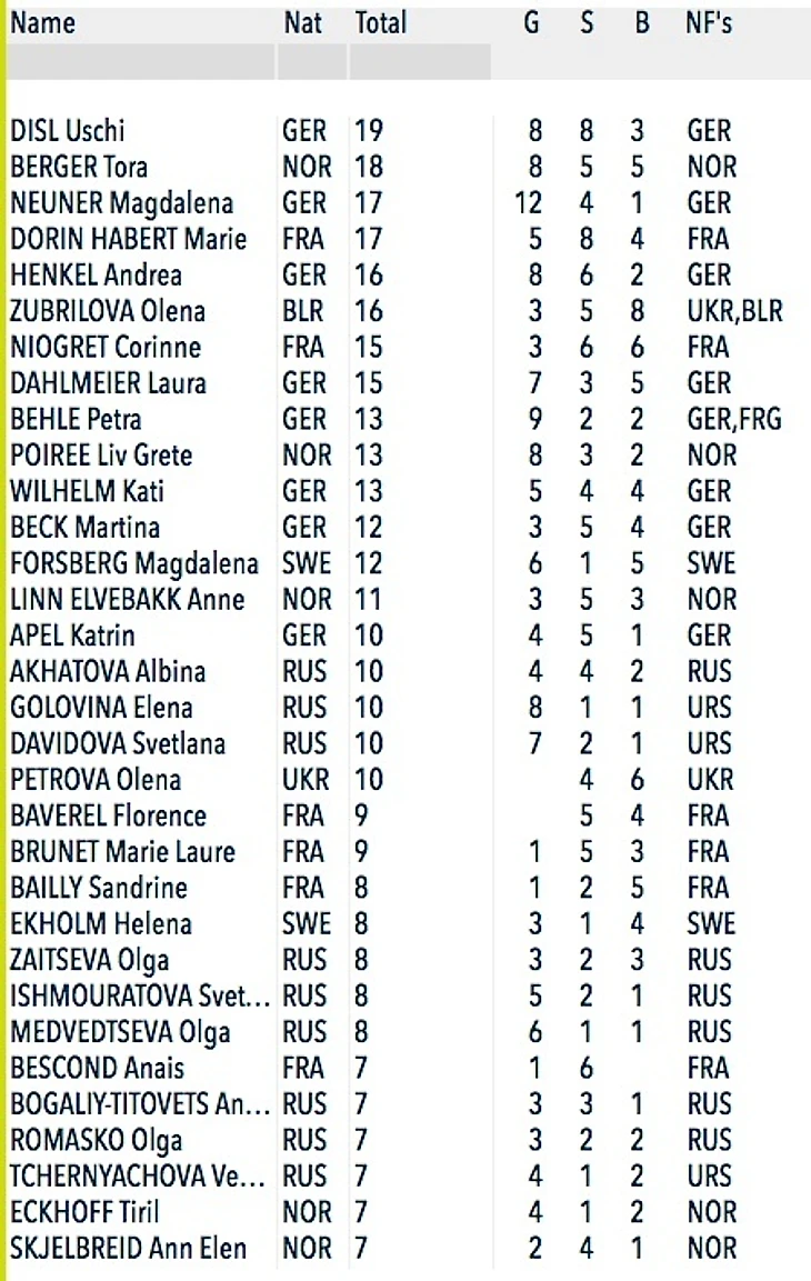А также таблица медалистов среди женщин на чемпионатах мира по биатлону: