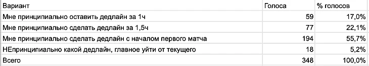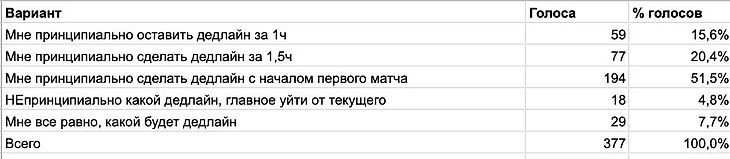 На 60% пользователей, проголосовавших за дедлайн с началом матча, приходится 40% несогласных.