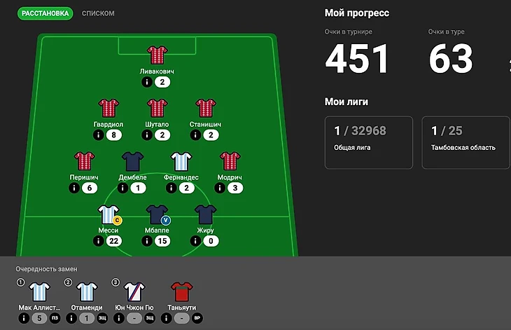 В финальном раунде в последнюю минуту решил отказаться от Ди Марии и убрал с Мбаппе капитанскую повязку. Это могло быть еще фатальнее для итогового результата (Андрей сделал капитаном Месси и получил 22 очка, с капитаном Мбаппе было бы 30 – Sports.ru).