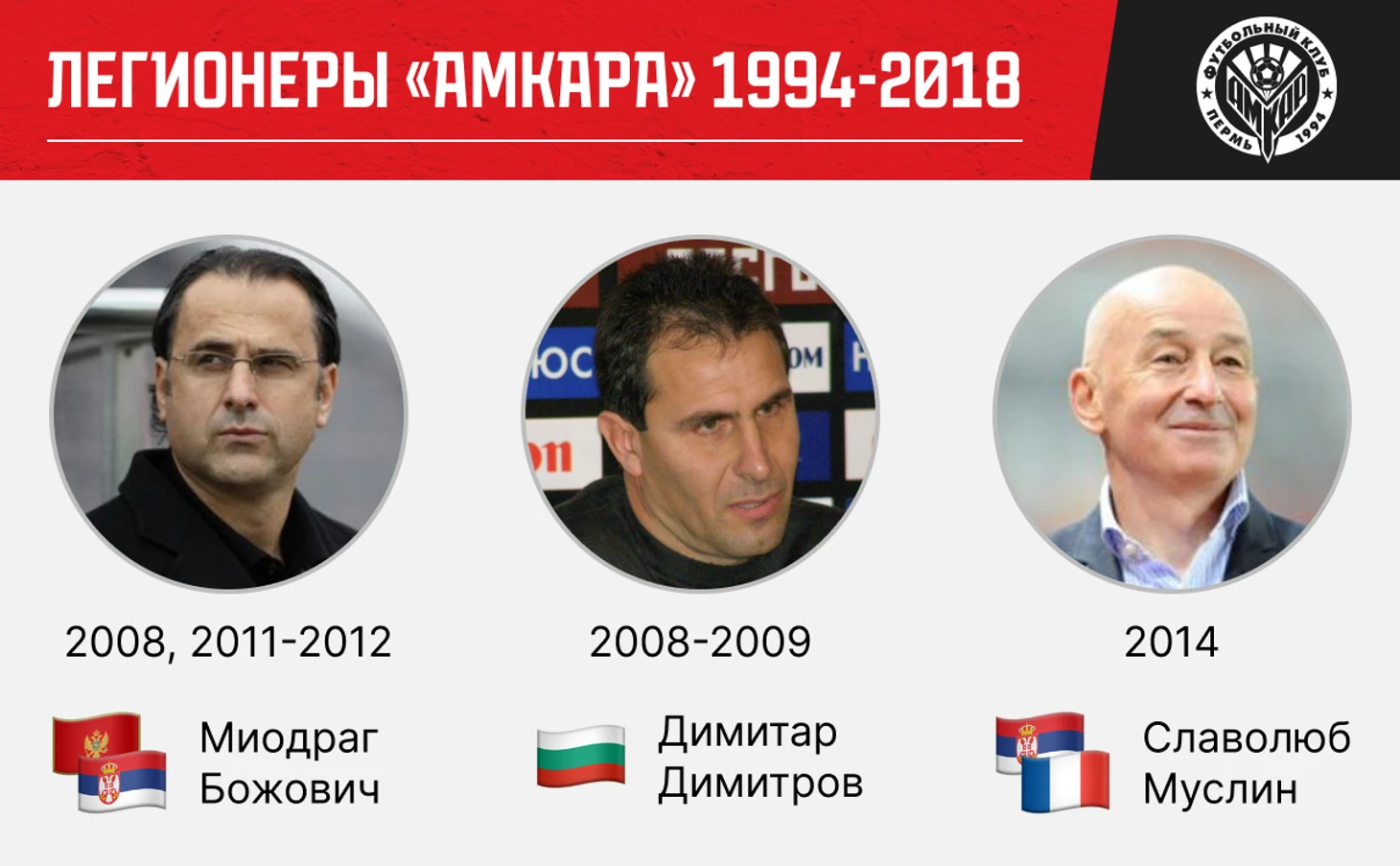 Тренеров-иностранцев было всего трое. Первым (и самым успешным) тренером-легионером стал Миодраг Божович. После его ухода в «Москву» в Пермь приехал болгарин Димитар Димитров и проработал чуть более полугода, запомнился только победой в ответном матче квалификации Лиги Европы над будущим финалистом турнира — «Фулхэмом».