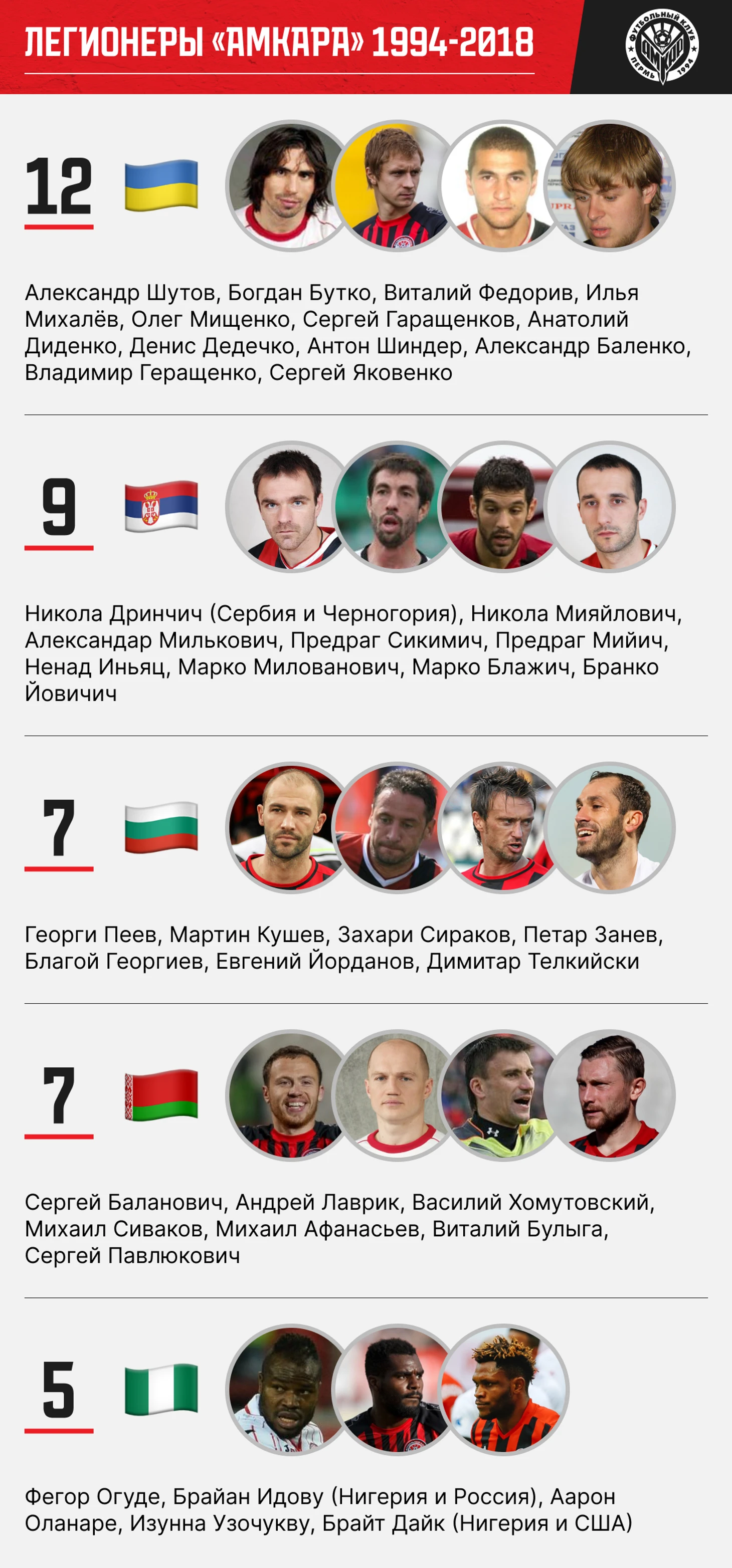 Лидируют постсоветские страны, Сербия, Болгария и — неожиданно — Нигерия: за «Амкар» играли аж 5 граждан этой африканской страны. Правда, того же Брайна Идову скорее назовёшь простым русским парнем, нежели нигерийцем: он родился Санкт-Петербурге, прошёл через молодёжку «Амкара» и всю жизнь играет в России.