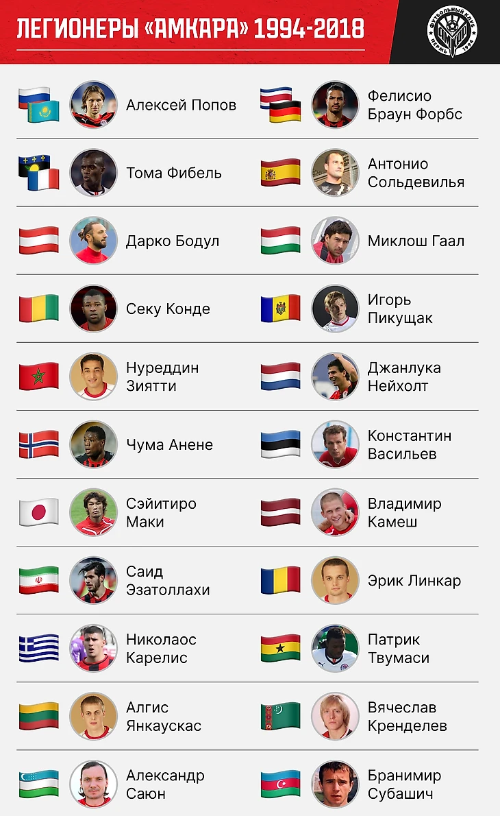 По одному футболисту из разных уголков планеты: от островов Карибского бассейна до Японии, от Северной Африки — до Прибалтики. В истории «Амкара» был японец, иранец, марокканец, испанец, нидерландец и даже капитан сборной Эстонии. Родившийся в Пермской области Алексей Попов успел сыграть 4 матча за сборную Казахстана. А африканские игроки приезжали в Пермь не только из Нигерии — вспомним ганца Твумаси и гвинейца Конде.
