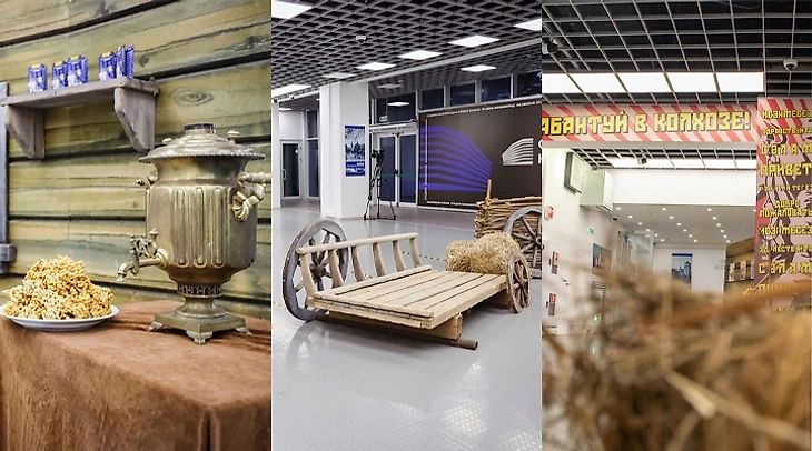 Гостей встречали в соответствующем для подобного мероприятия интерьере: по пути от автобуса до раздевалки расположили телегу, стену с тематическими плакатами в советском стиле, самовар, традиционные угощения. И настоящий рулон сена.