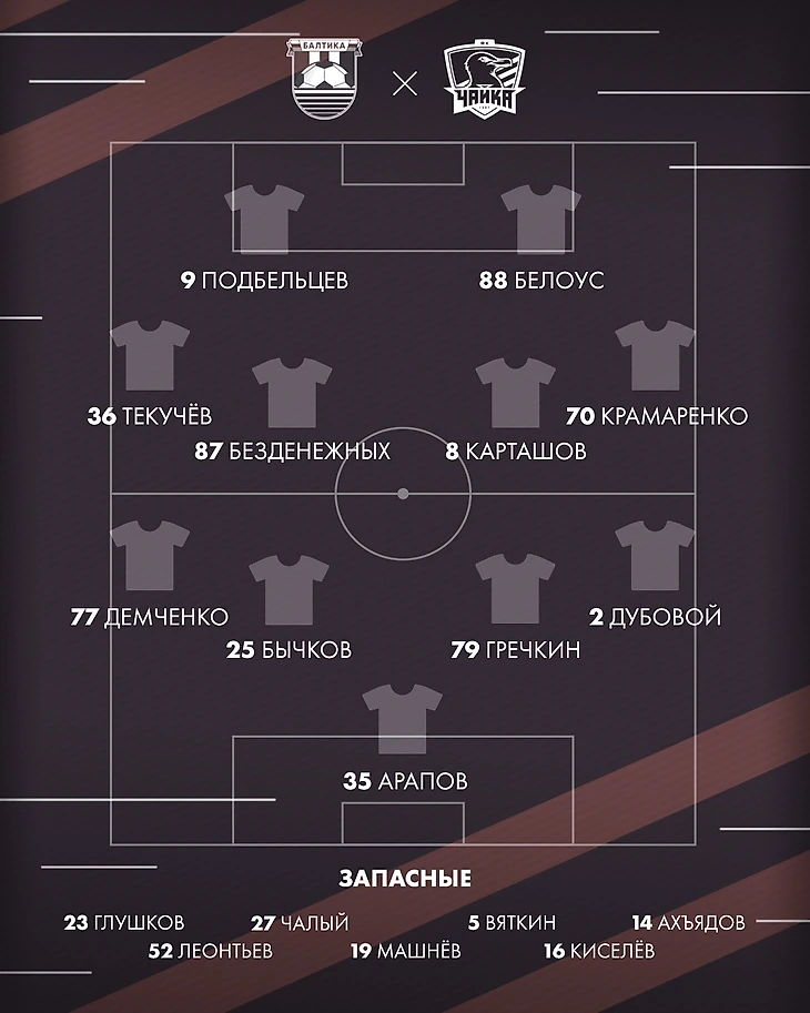 Главный тренер песчанокопцев Дмитрий Воецкий опробовал в этом матче новую схему 4-4-2 вместо ранее использовавшейся 4-2-3-1. В стартовом составе дебютировали сразу три новых футболиста: в центре обороны вышел Гречкин, заменивший Тумасяна (у Дениса, по-видимому, травма), в центре полузащиты в основе появился Карташов, заменивший Леонтьева, на правом фланге полузащиты сыграл Крамаренко, а не Павленко, а пару нападающих составили Подбельцев и Белоус, Машнев остался в запасе. Все вышедшие на поле ребята ковали победы "Чайки" в ПФЛ, очень приятно наблюдать состав, близкий к тому, что демонстрировал яркую игру в прошлом сезоне.