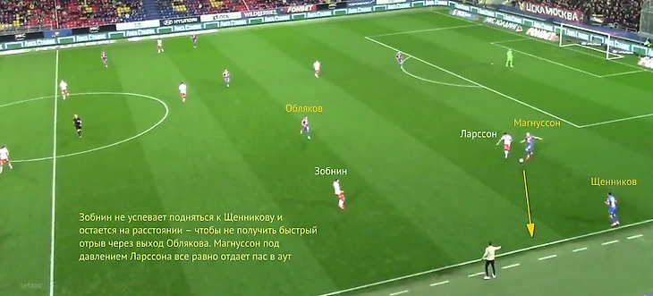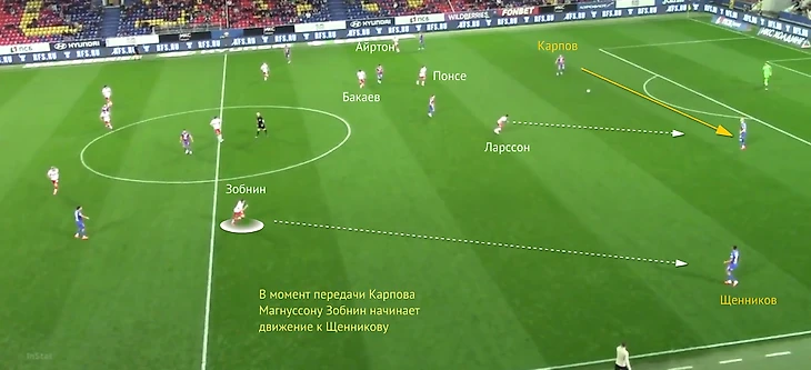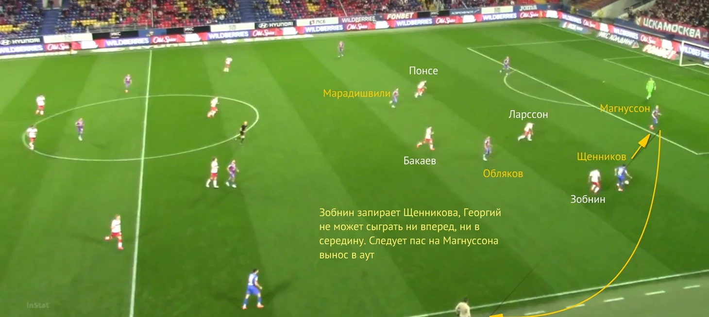 Одна из причин пассивности ЦСКА – реальный прессинг «Спартака» на чужой половине, в том числе сразу после потери мяча. При начале позиционных атак армейцев Понсе играл по Карпову (несколько раз вынуждал выносить мяч, но Айртон три раза за матч пустил Фернандеса за спину, поэтому один такой вынос в первом тайме привел к опасности у штрафной «Спартака»), Ларссон – по Магнуссону, Зобнин поднимался к Щенникову, Айртон – к Марио Фернандесу, а Бакаев прихватывал кого-то из пары Обляков – Марадишвили. Обычно давление начиналось при передачах Карпова и Магнуссона во фланг (чаще – на Щенникова).