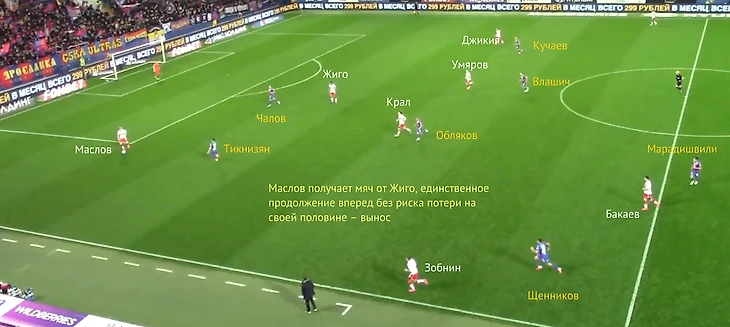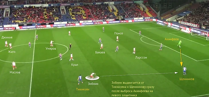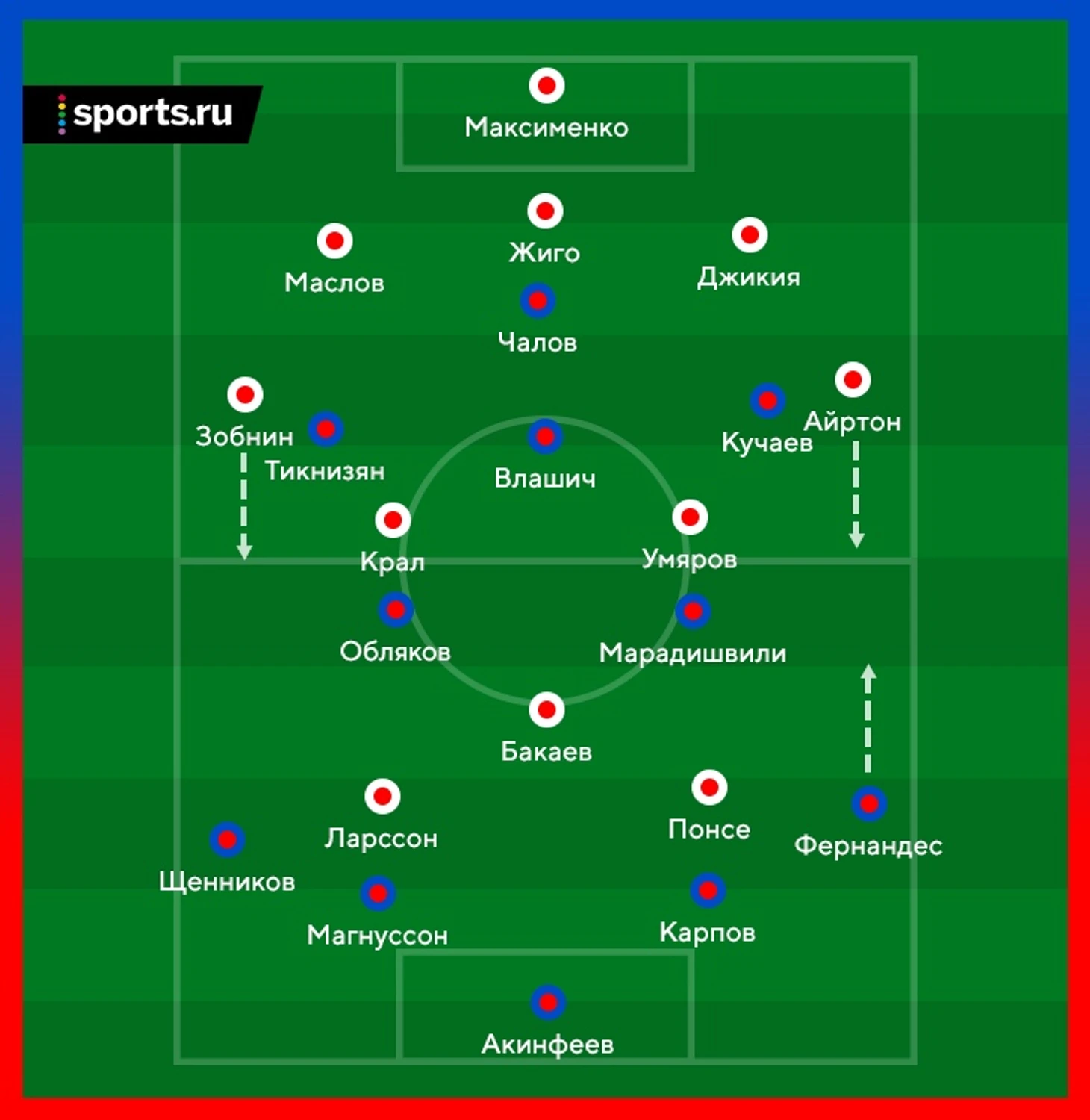 При давлении ЦСКА Тикнизян играл по Маслову, Кучаев – по Джикии, а Щенников и Фернандес поднимались к Зобнину и Айртону. Очень важную роль для Гончаренко играл Марадишвили – единственный игрок середины, который не поддерживал агрессию и оставался рядом с центральными защитниками (и Бакаевым).