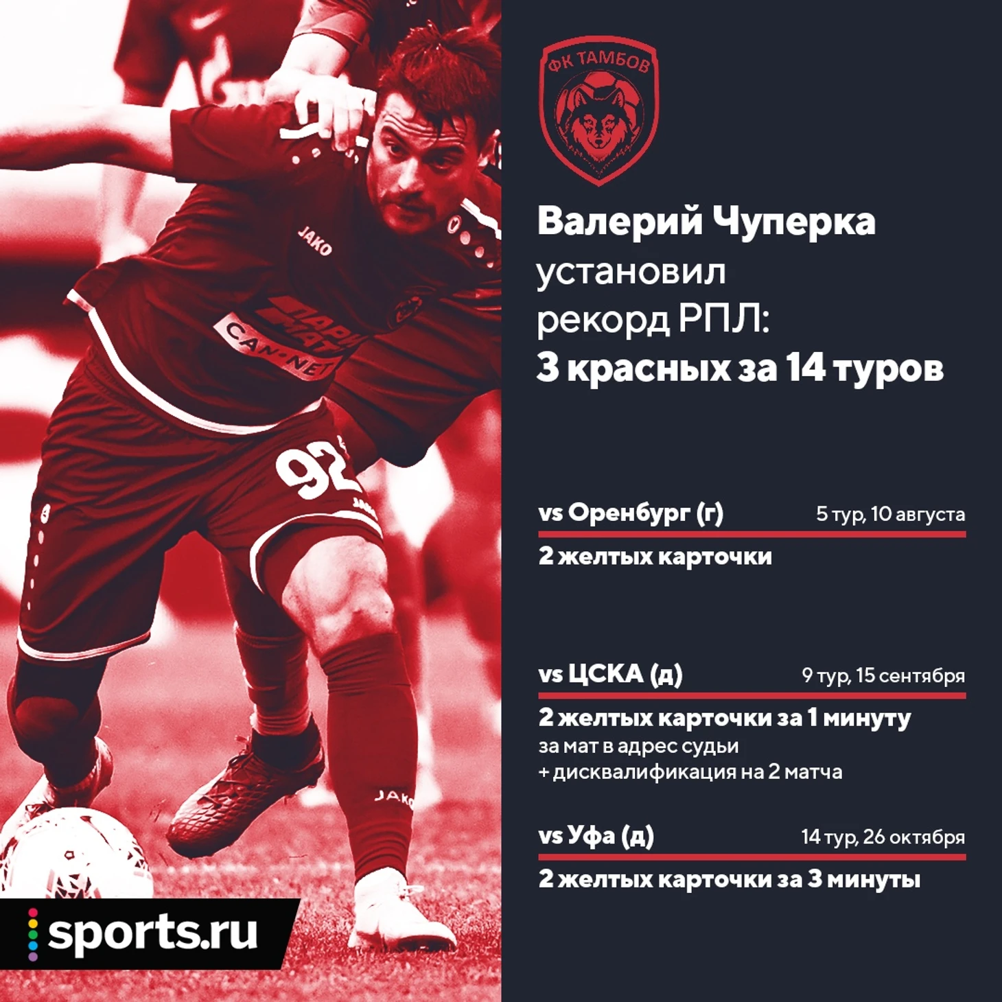 • До этого три красные за сезон получали 8 футболистов РПЛ, но никого не удаляли 4 раза. Чуперка может стать первым.
