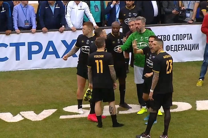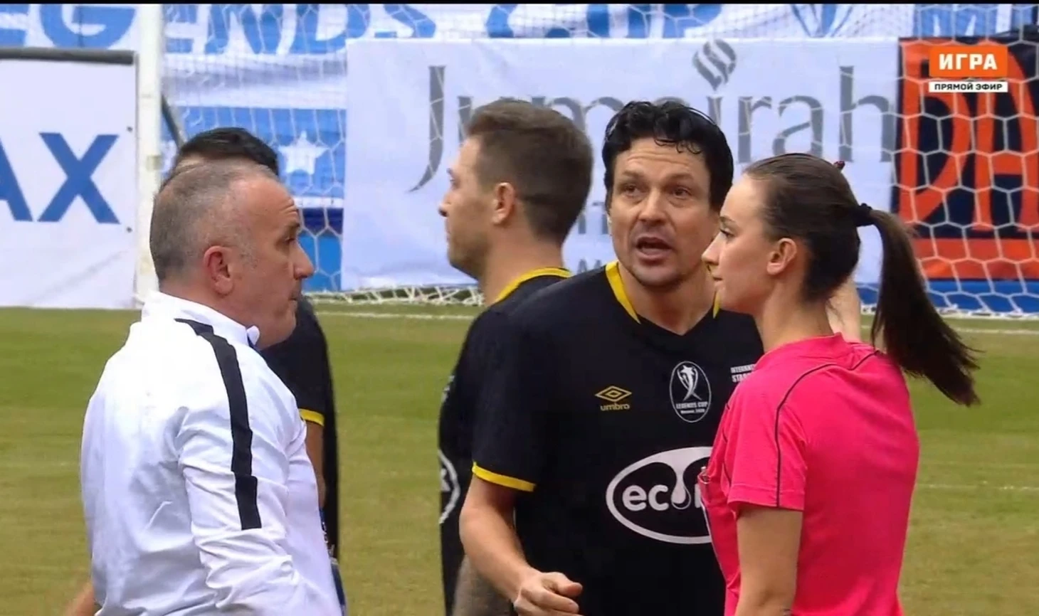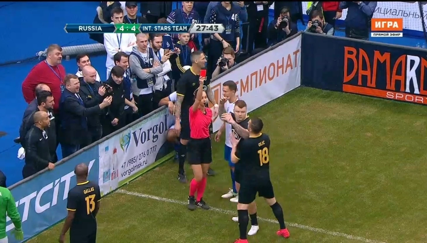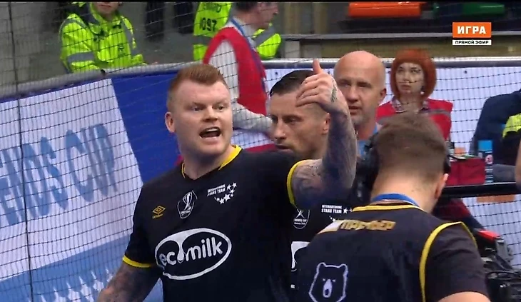 Когда время на табло закончилась, сборная звезд выбила мяч на трибуну. Но Александра Пономарева не свистнула, а сирены тоже не прозвучало. Пока Риисе, Плетикоса и компания обнимались, сборная России разыграла аут и быстро забила гол.