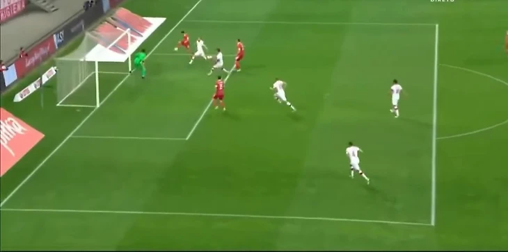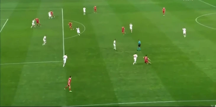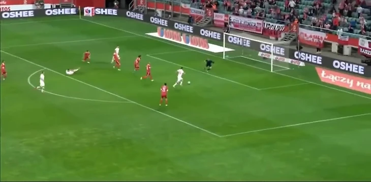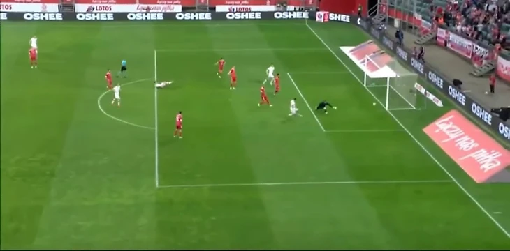 Момент начался с неудачного выноса Шунина. Дальше Матеуш Клих отличным пасом нашел в штрафной Пшемыслава Франковского, который невероятным образом избежал офсайда. Тройка защитников явно перемудрила.