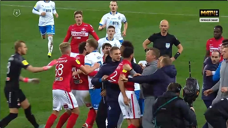 Матч «Спартака» и «Динамо» стал огненным не из-за большого количества опасных моментов – первый тайм закончился мощной потасовкой, которая подтвердила статус дерби.
