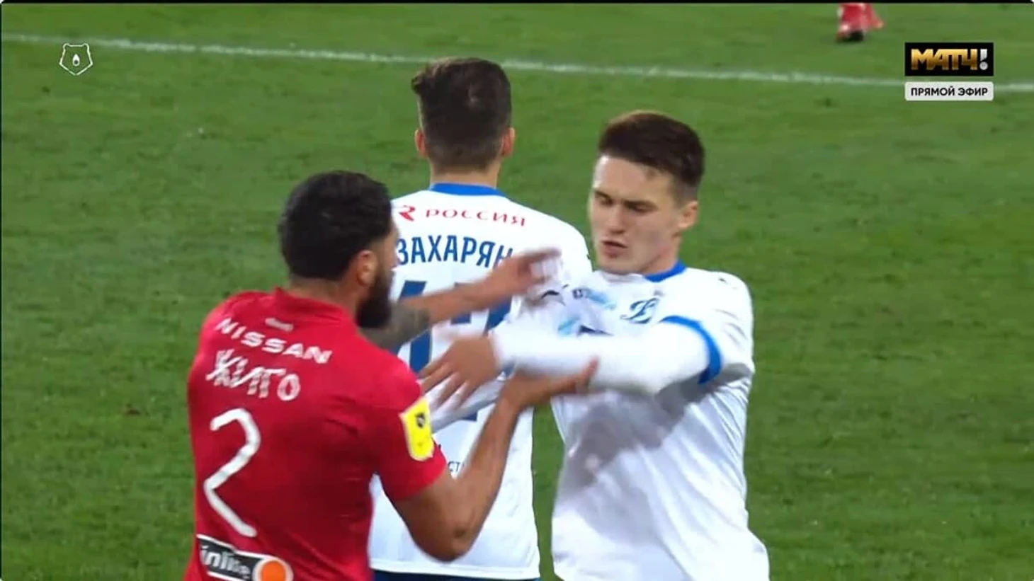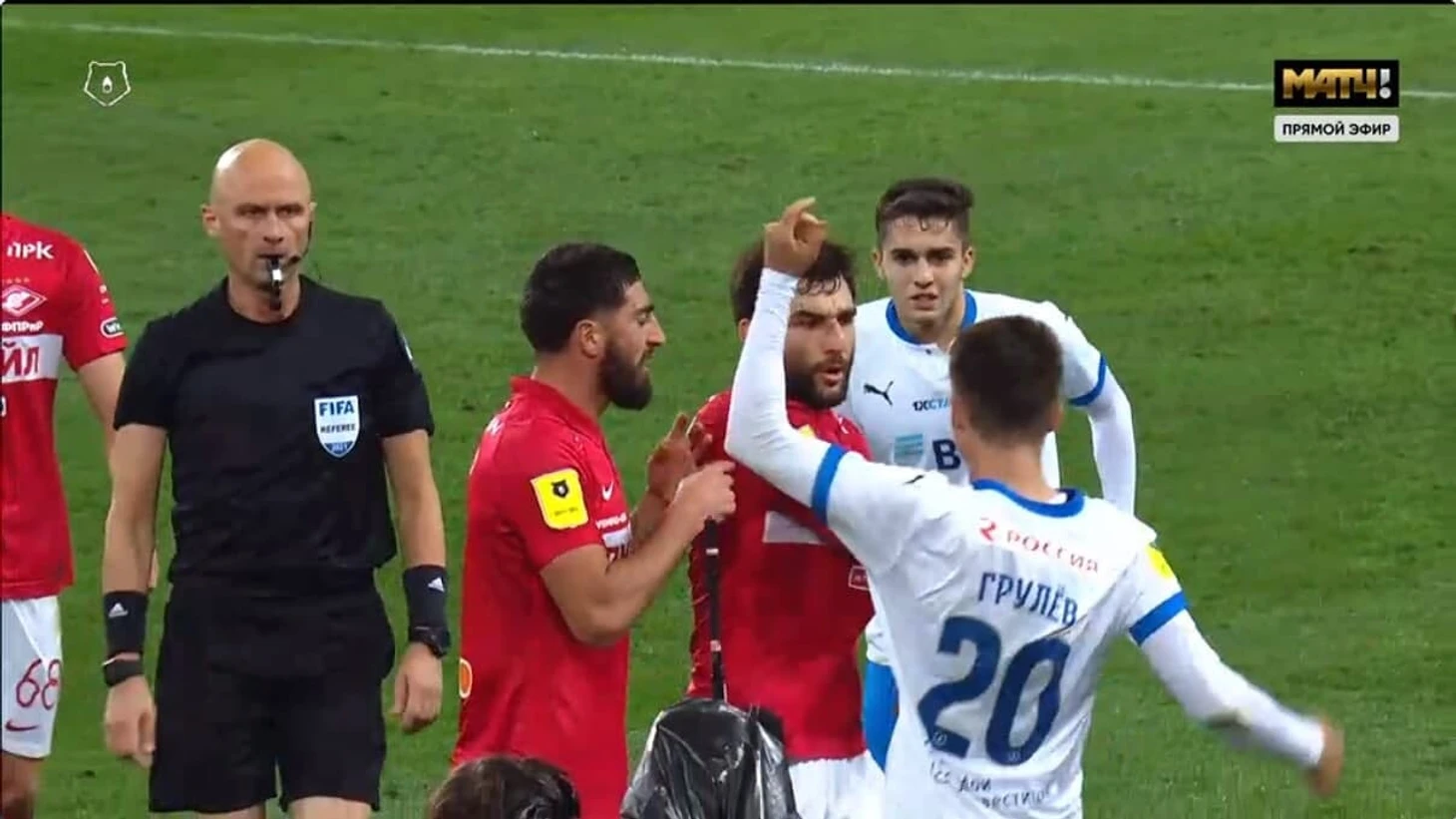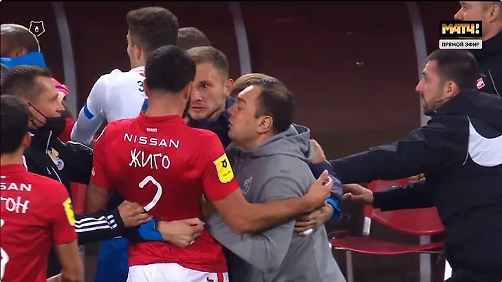 Карасев сначала дал продолжить игру, но это продлилось недолго: игроки «Спартака» пошли разбираться. Первым подключился Самюэль Жиго – он показал судье, что Захарян фолит не впервые, а тот с усмешкой переспрашивал у француза: «Что два?».