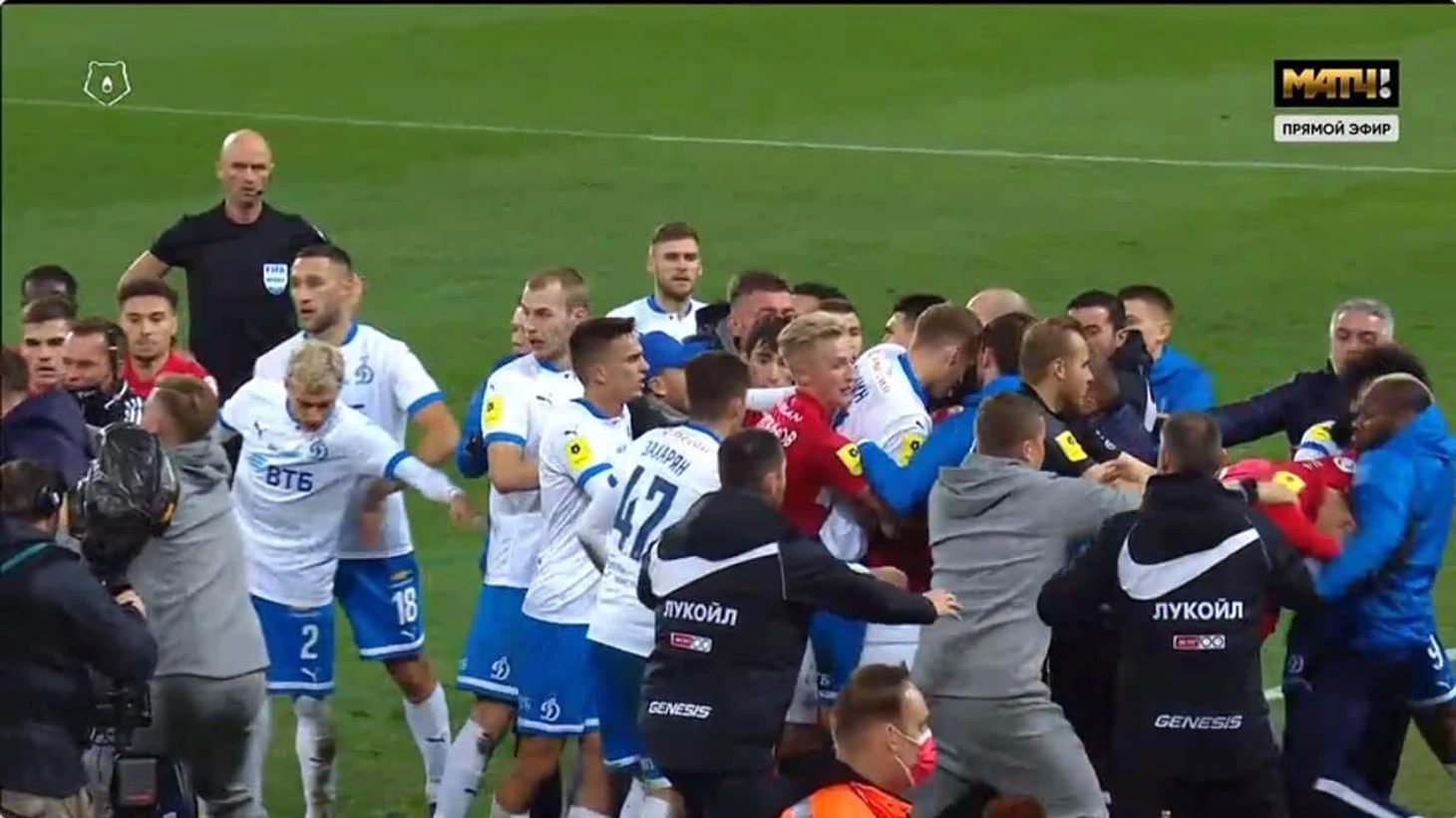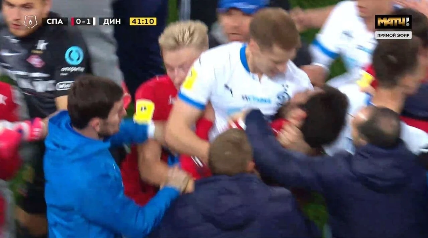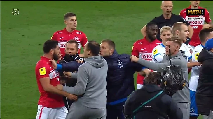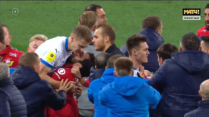 В другой горячей точке участвовали Джикия, Нжи, Соболев, Фомин, Игбоун и тренерский штаб «Динамо» (произошло все у скамейки бело-голубых).
