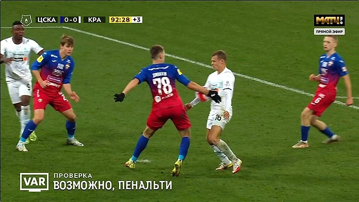 После просмотра эпизода на мониторе судья убедился в отсутствии нарушения правил игры в действиях игрока ЦСКА и продолжил игру».