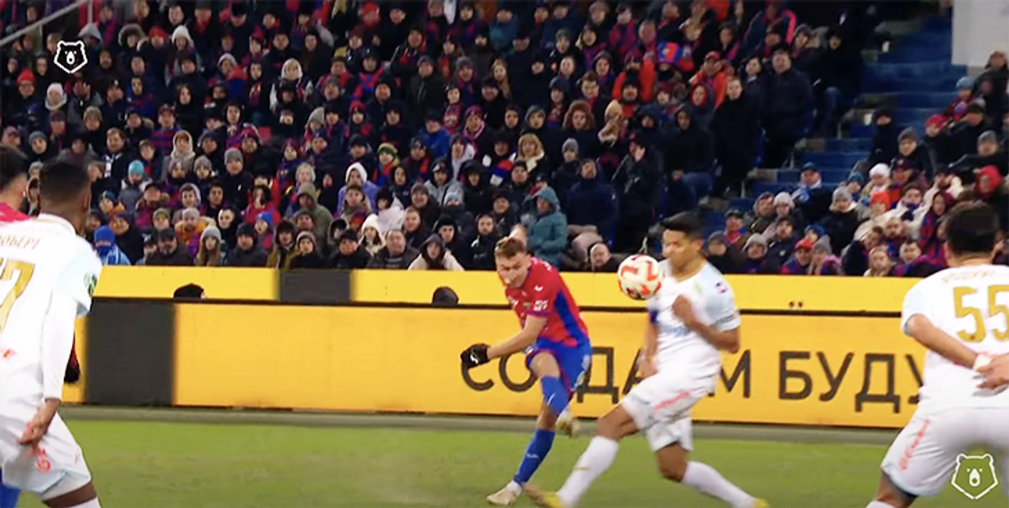 Форвард ЦСКА решился пробить из не самой очевидной позиции, перед ним было довольного народу, и это в итоге помогло.