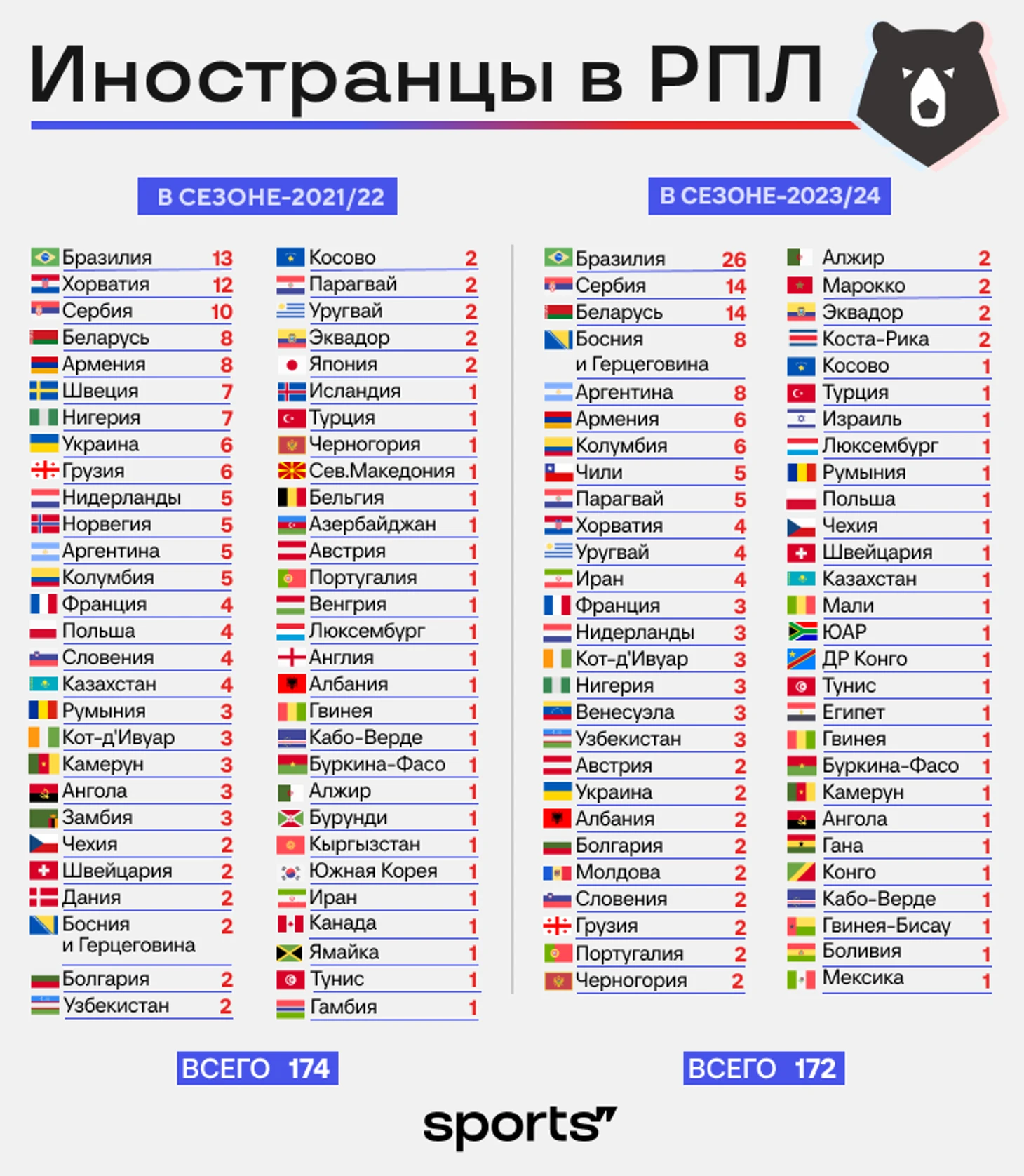 ● Transfermarkt пишет о 182 иностранцах в РПЛ в сезоне-2021/22. На самом деле их было на восемь меньше – 174. Просто восемь футболистов выступали за две команды. Это Наир Тикнизян (ЦСКА, «Локомотив»), Гжегож Крыховяк («Локомотив», «Краснодар»), Сильвие Бегич («Крылья Советов», «Рубин»), Виталий Лисакович («Локомотив», «Рубин»), Джордже Деспотович («Рубин», «Арсенал»), Сильвестр Игбун («Динамо», «Пари НН»), Матео Барач («Сочи», «Крылья Советов») и Сенен Себаи («Химки», «Ахмат»).