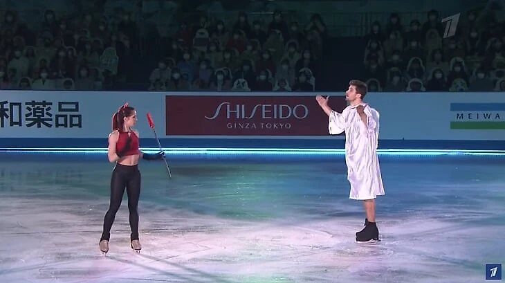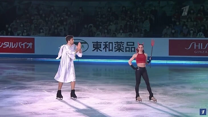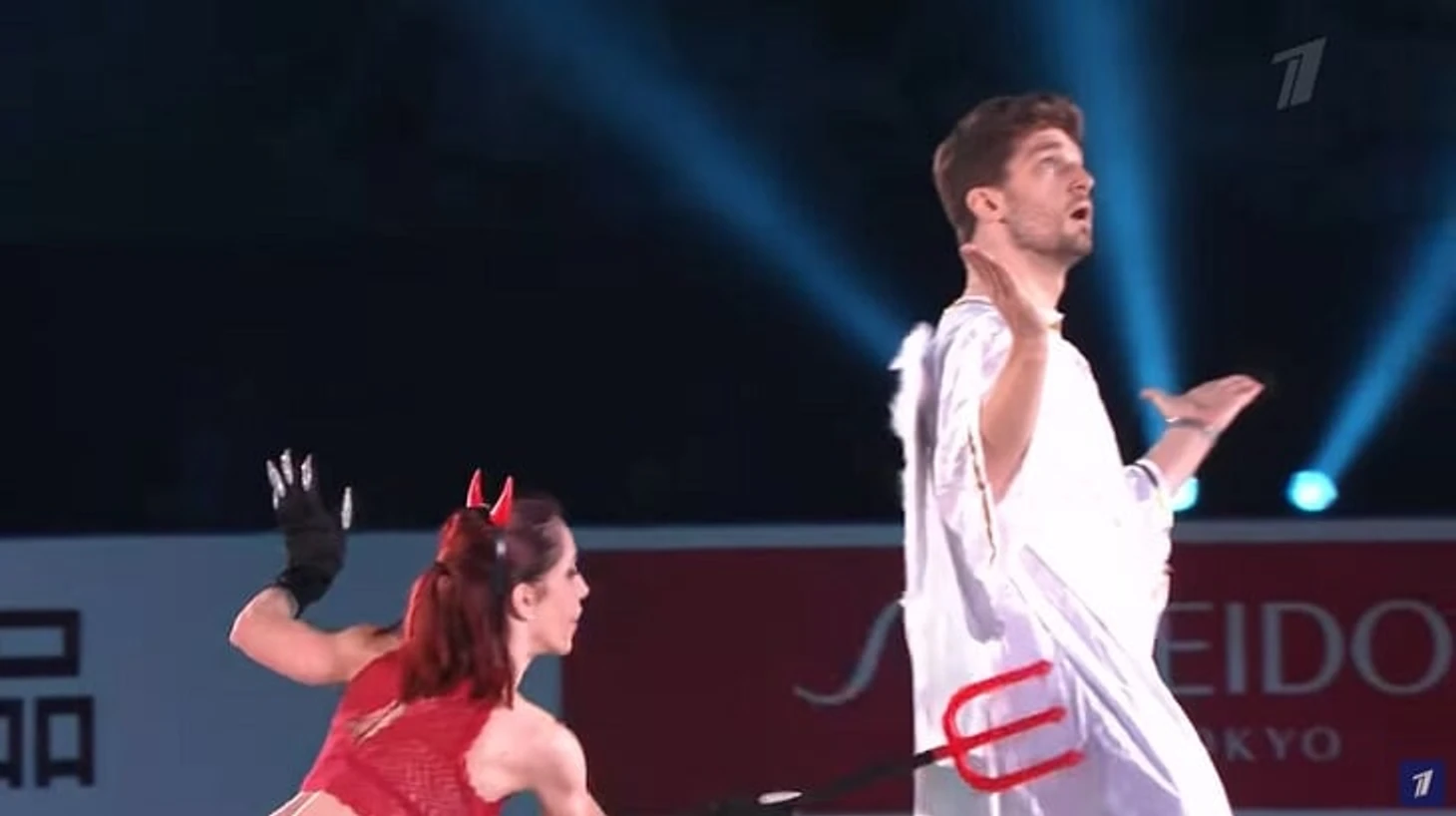 В конце номера фигуристы остались уже без дьявольских атрибутов: Делла Моника сняла перчатки с когтями, а Гуаризе откинул за бортик рожки. И номер с, казалось бы, глубоким подтекстом превратился в трибьют мировым хитам рок-музыки. Вышло очень ярко.