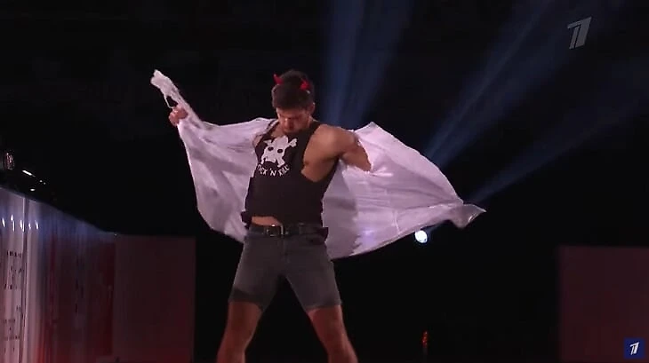 После выкрика Гуаризе сменилась песня – зазвучала Highway to Hell («Дорога в ад») от AC/DC. И тут же ангел изменился до неузнаваемости – закачал головой в такт музыке, свистнул в сторону партнерши и разорвал на себе белое одеяние, оставшись в серый шортах и черной майке с черепом.