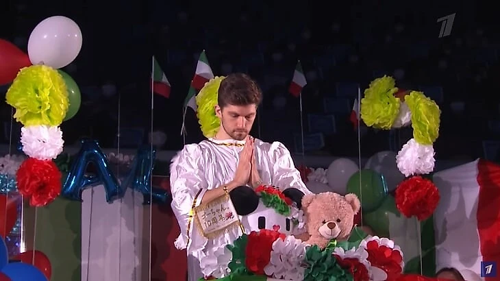 Под голоса хора на трибунах появился Гуаризе со сложенными в молитве руками, воздел их вверх и, перекрестившись, вышел на лед. На Маттео была белая атласная ряса до колена, а на спине – крылья.