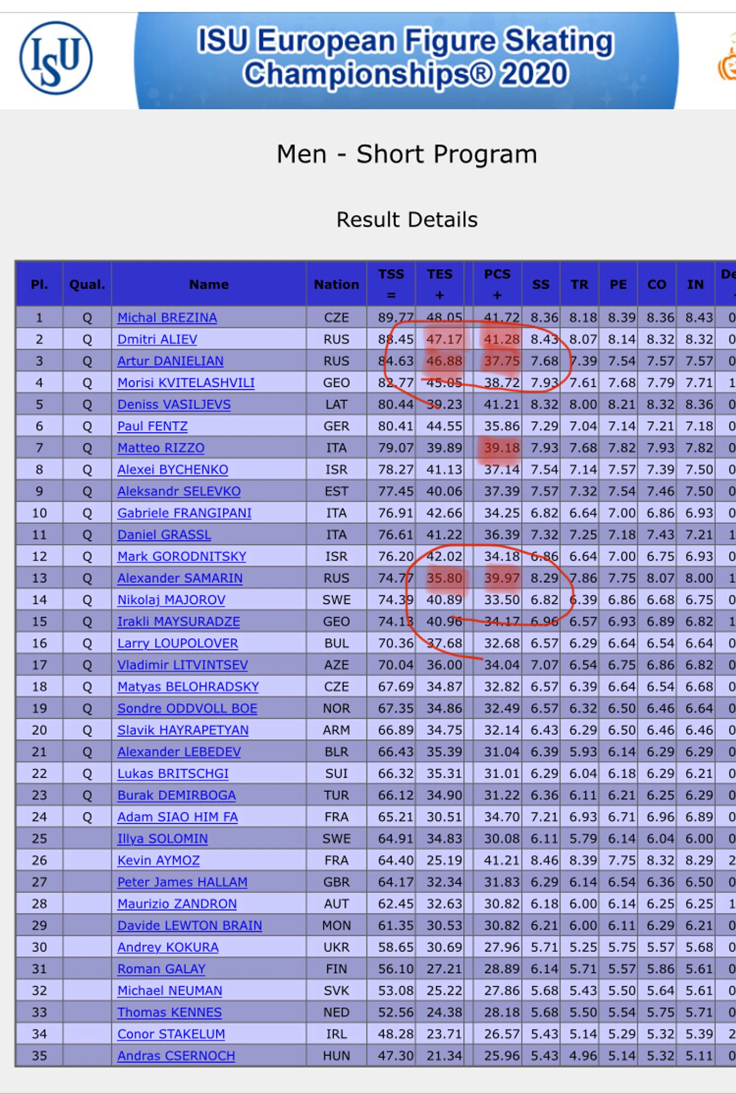 Допустим, Даниелян несмотря на артистизм и хороший конёк все же юниор, у него первый взрослый международный старт и сразу чемпионат Европы. Худо-бедно можно, натягивая упирающуюся сову на глобус объяснить, как он с чистым прокатом (в сравнении с Самариным) получил меньше Саши с грубыми срывами даже в компоненте презентации (презентации, Карл!) .