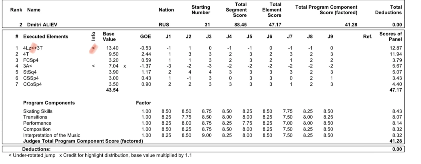 К тому же Дмитрию Алиеву, который сейчас идёт вторым после короткой программы, судейская бригада не была благосклонна от слова совсем. У него стоит недокрут на 4-ном лутце...