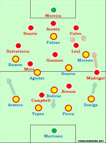 Стартовая схема Гомеса был простой 4-5-1 / 4-3-3. Две фланговых игрока сначала играли относительно низко, но как выяснилось, это оказалось перестраховкой, учитывая то, что Коста-Рика полностью отдала инициативу. К тому же располагаясь в более высокой позиции, они создавали дополнительные трудности, для обороны Коста-Рики растягивая ее. Еще одним интересным наблюдением стала позиция Густаво Боливара – он порой опускался очень глубоко, почти на одну линию с центральными защитниками и тем самым позволял крайним защитникам активно подключаться к атаке – в чем-то его игра напоминала манеру игру Серхио Бускетса за Барселону. Из двух крайних защитников, Пабло Армеро является более атакующим игроком и имел больше свободного пространства, однако подключения в атаку Хуан Камило Суньига, играющем на правом фланге обороны, таили в себе большее опасности.