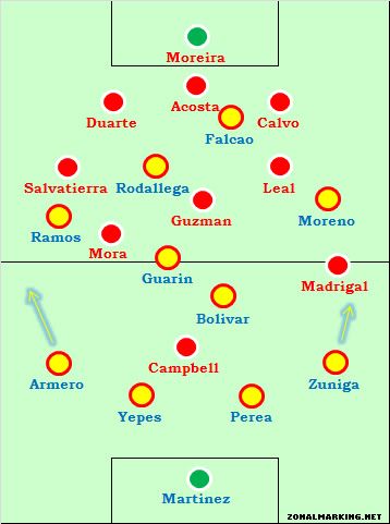 Эрнан Гомес удивил, оставив в запасе Кристиана Сапату (проведшего хороший сезон в Удинезе), и доверился паре более опытных защитников – Луису Переа и Марио Йепесу. Так же на скамейке запасных начал матч Уго Родельега.