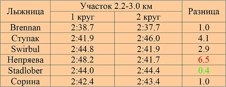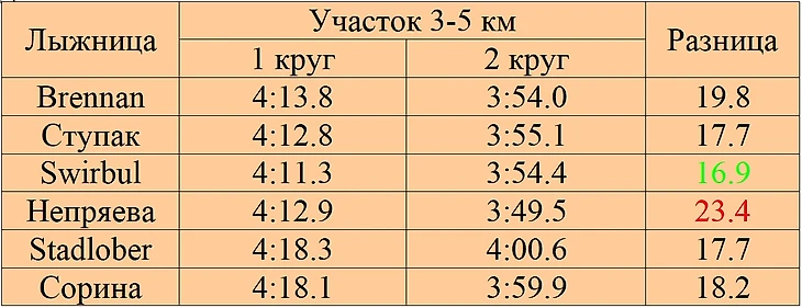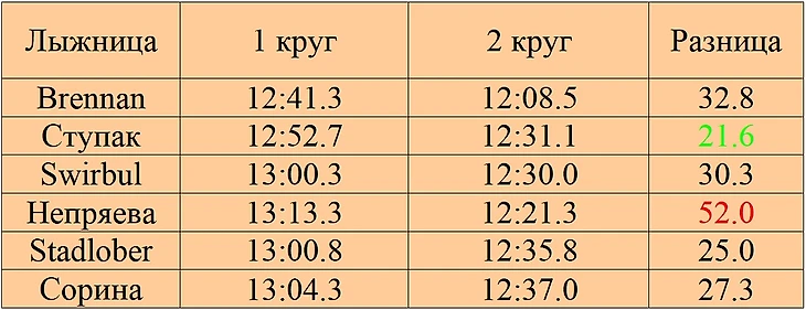 Как видим, тенденция сохраняется и все лыжницы пробежали второй круг быстрее первого. По стабильности Ступак лучшая, Непряева закономерно худшая. Если честно ее расклад по кругам просто ужасный, проиграть на первом участке 2.2км почти 25 секунд Brennan ради того, чтобы на сэкономленные силы на 2м круге на последнем участке 2км привезти ей же менее 5 секунд.