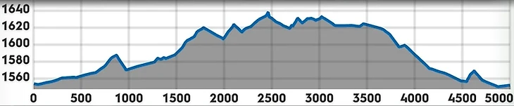 Как видим первый участок 0-2.2 км это почти сплошной подъем, второй участок 2.2-3 км это оставшийся последний подъем до самой верхней точки, спуск и еще один небольшой подъем и заключительный участок 3-5 км это небольшой участок равнины и спуск.