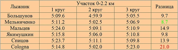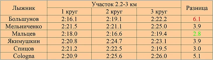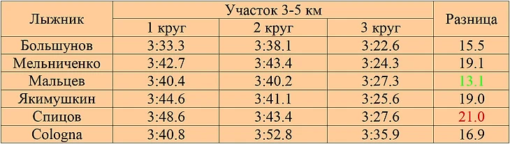 Последний участок Мельниченко, Мальцев, Якимушкин и Спицов первые 2 раза прошли более менее ровно, последний раз намного быстрее, Большунов и Cologna хуже всего второй раз, быстрее всего последний раз. По стабильности Мальцев лучший, Cologna худший. На данном участке Большунов на каждом круге был быстрее остальных.