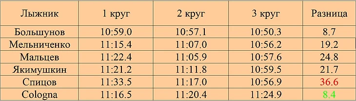 Все наши лыжники проходили каждый круг быстрее предыдущего и лишь Cologna, наоборот, только сбавлял темп, однако отдадим должное, проходил круги он очень стабильно, как впрочем и Большунов, однако Александр мало того, что проходил все быстрее и быстрее, так еще и единственный из всех кто смог пройти каждый круг быстрее 11 минут. Спицов по стабильности худший, но ему простительно, после болезни скорее всего сильно не начинал, чтобы хватило сил на всю дистанцию.