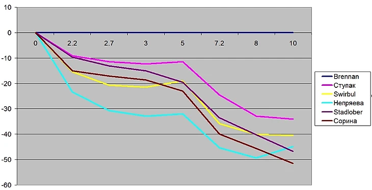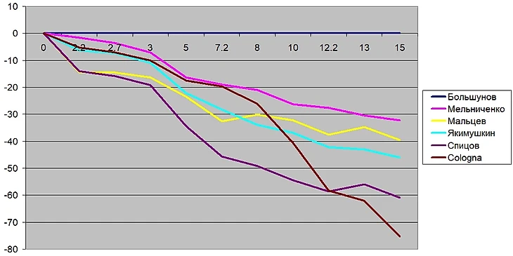 Отсюда видно, что почти все свое преимущество Александр получал на двух длинных участках: первом протяженном подъеме и на равнине и спуске, лишь немного при этом проигрывая на центральном коротком участке Мальцеву и Спицову и то не на каждом круге.