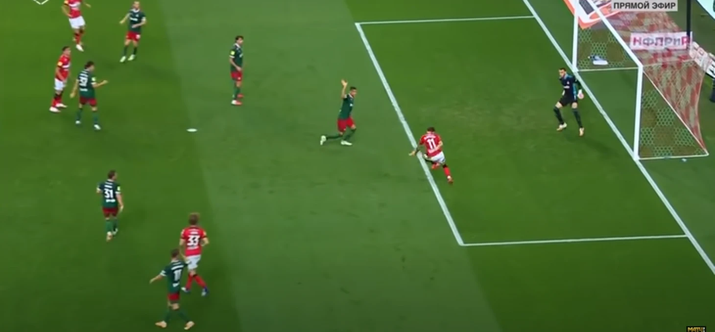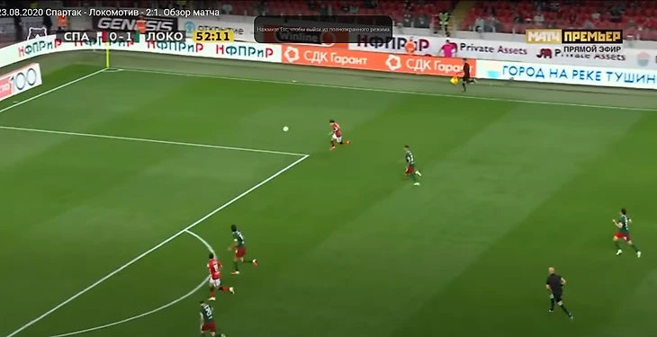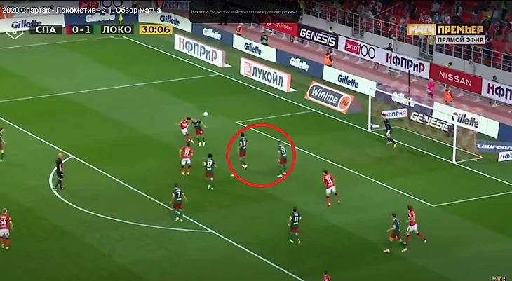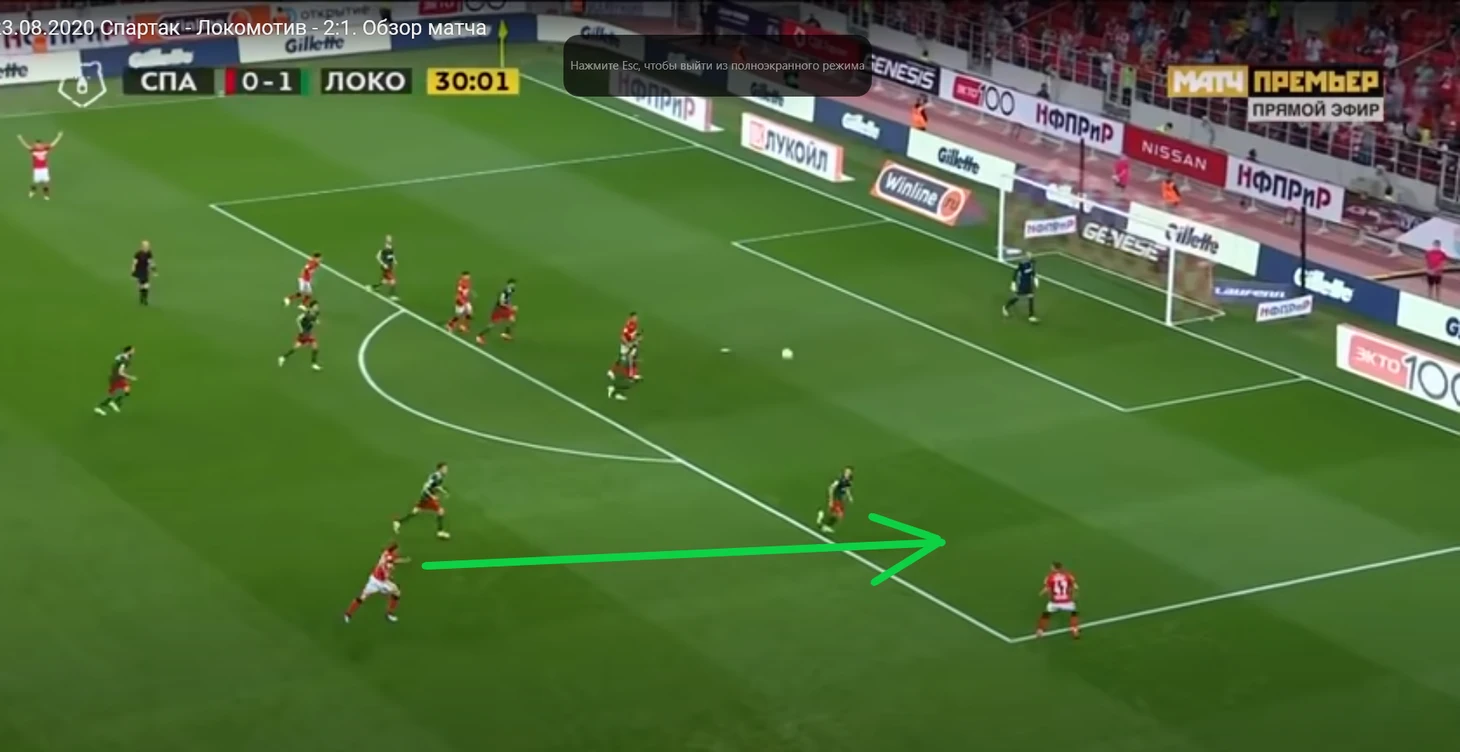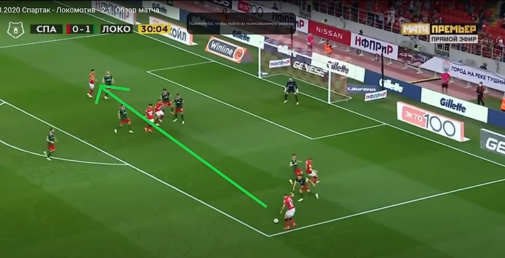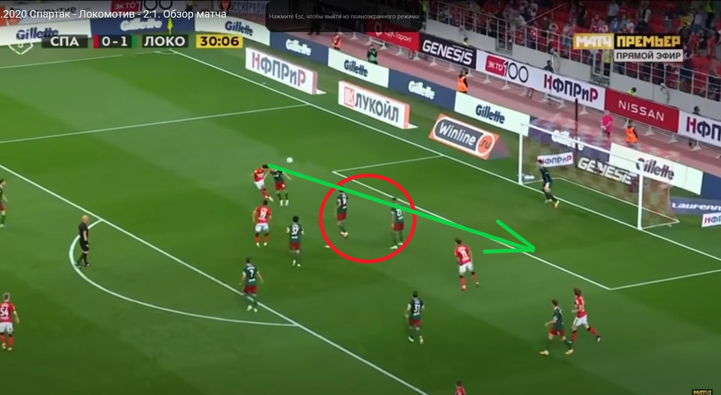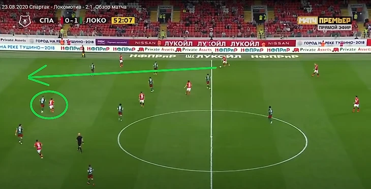 В матче 4 тура Спартак- Локомотив при переводе мяча с левого фланга на правый, спартаковцы заставили высоко подняться защитников Локомотива, и посмотрите как ошибся защитник (позиционно и индивидуально 1 в 1), находясь спиной к своим воротам, дав возможность сопернику убежать за спину: