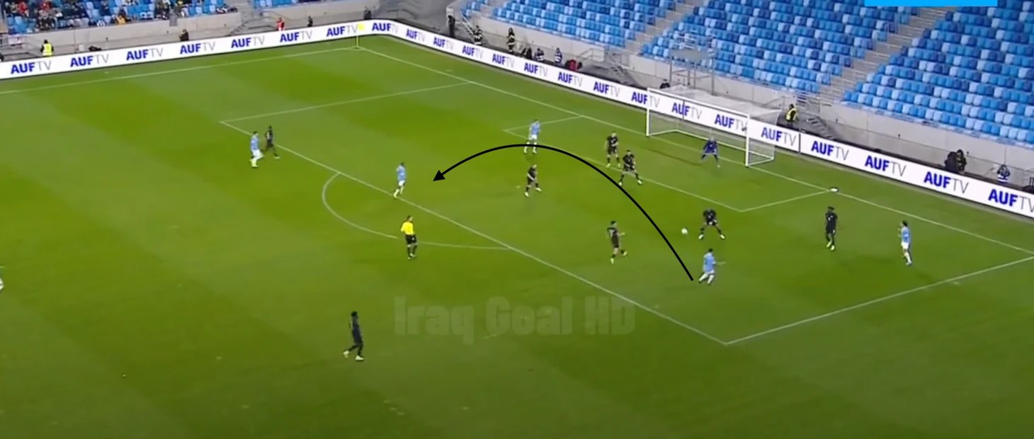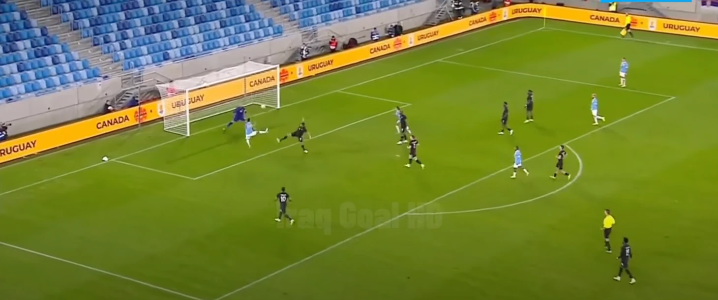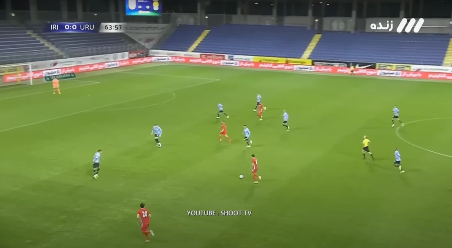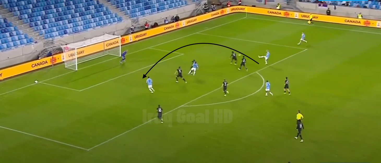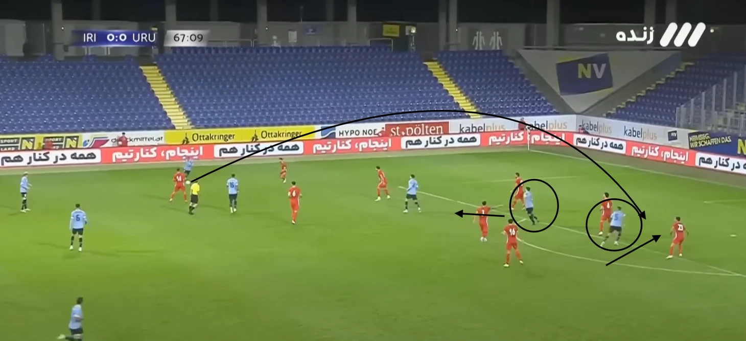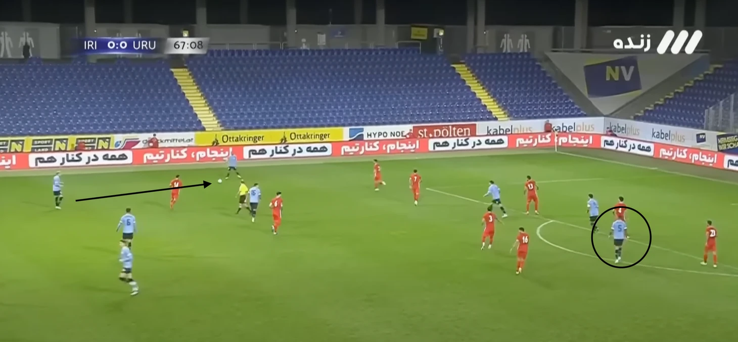 Уругвайцы очень любят врываться в свободную зону под забросы, когда это совсем неочевидно. Чаще всего это делает Суарес, но в данной ситуации он выполняет другую роль - обратите внимание, что в момент передачи он дернулся вперед, отвлекая защитника иранцев, которому был послан мяч за спину.