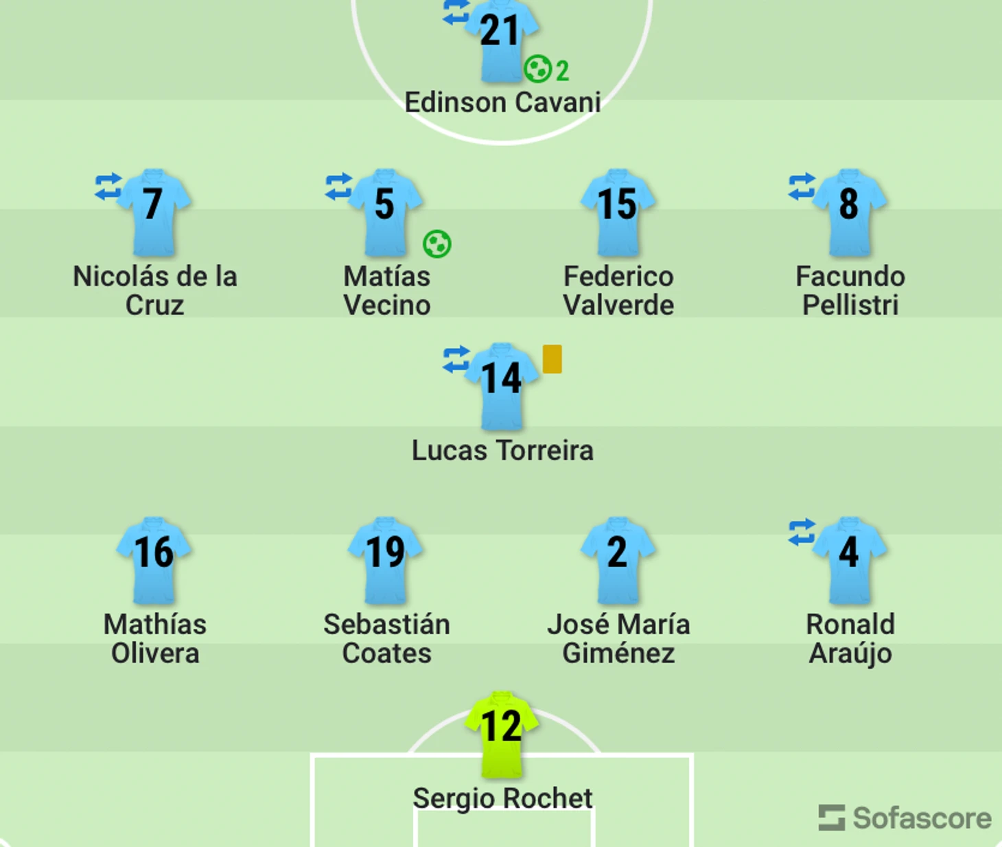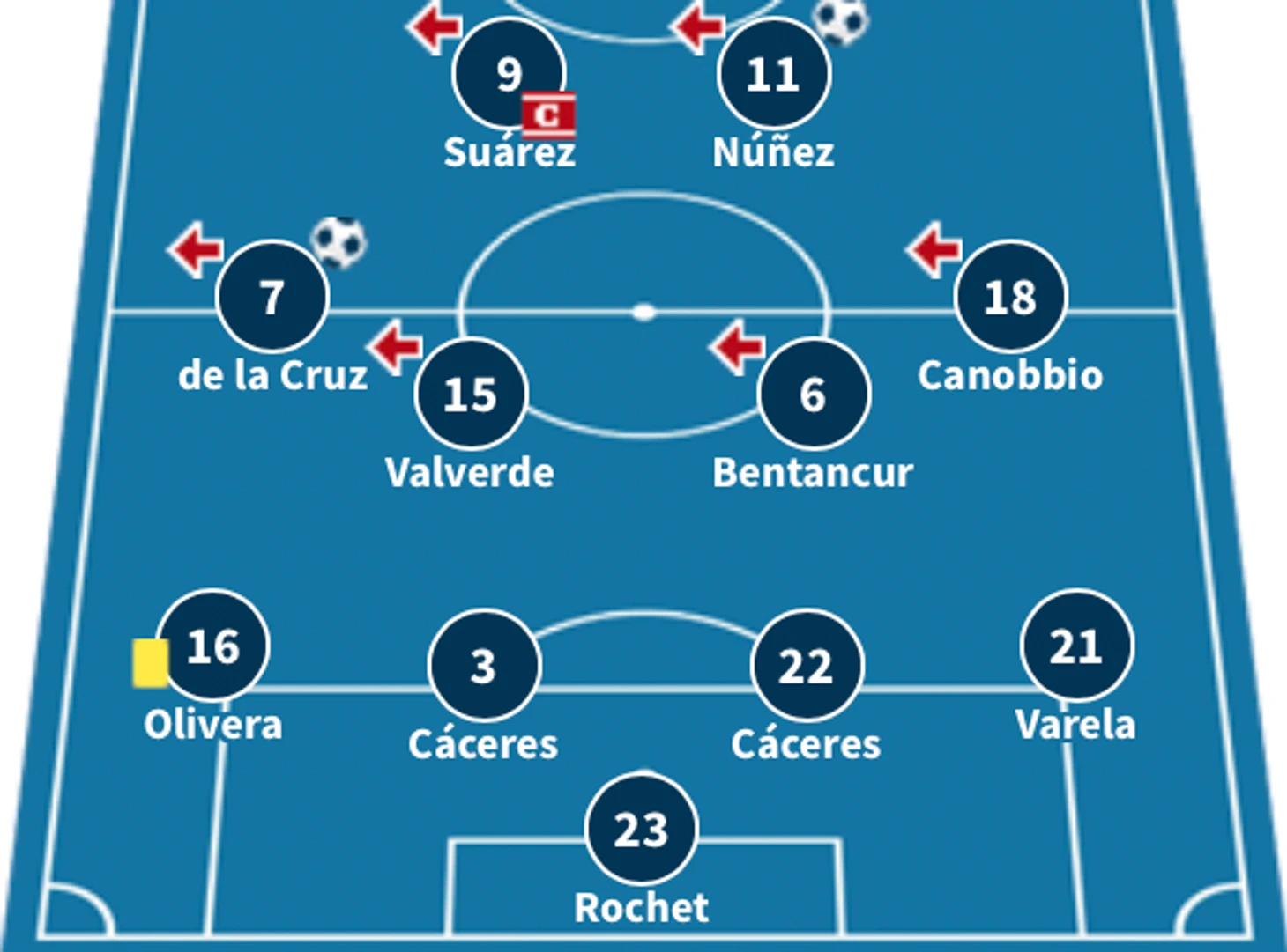 Схема игры сборной Уругвая: 4-4-2, иногда 4-3-3 (атакующая).
