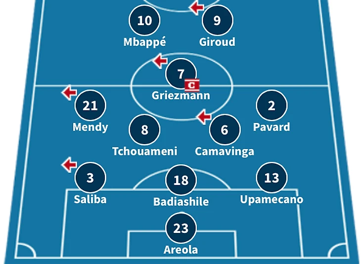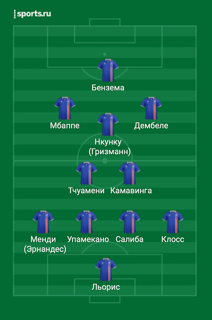 Полузащита: опорная зона – Тчуамени и Камавинга, атакующая зона – слева Мбаппе, в центре Нкунку, справа Дембеле.