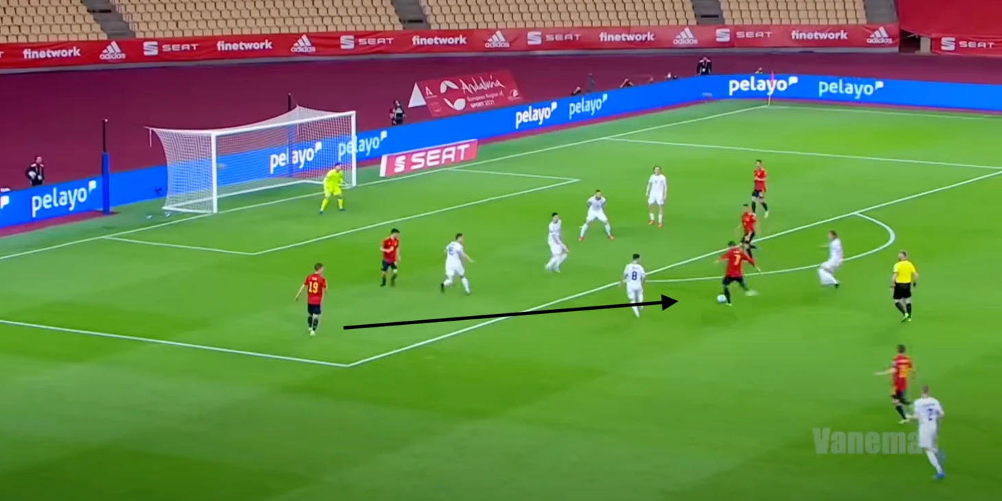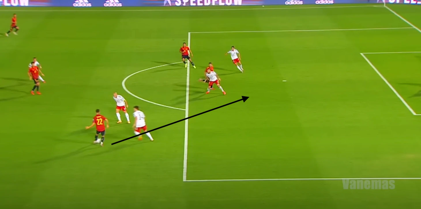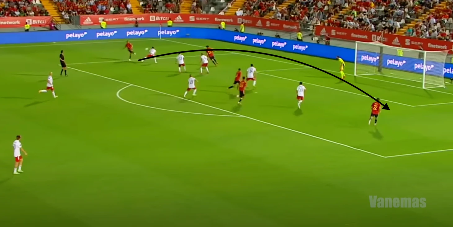 Испанцы потрясающе смотрятся на флангах. Интересно, что в отличии от многих команд они используют не скоростные атаки, а затяжные, создавая себе преимущество численным превосходством и игрой накоротке. Нередко они устраивают на краю штрафной отвлекающий маневр, чтобы стянуть на себя внимание обороны соперника и перевести мяч на противоположный фланг.