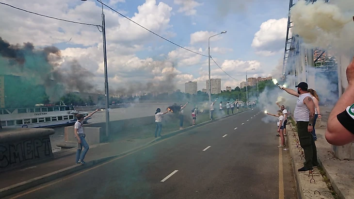 И пусть финальный аккорд будет мажорным: В воскресенье, перед решающим матчем, болельщики Торпедо, видимо, вдохновившись опытом чемпиона РПЛ этого года (не будем называть команду), встречали автобус команды с фаерами. Дрона видимо не было, поэтому такого красивого видео нет. Но есть одно фото, которое передает атмосферу момента:
