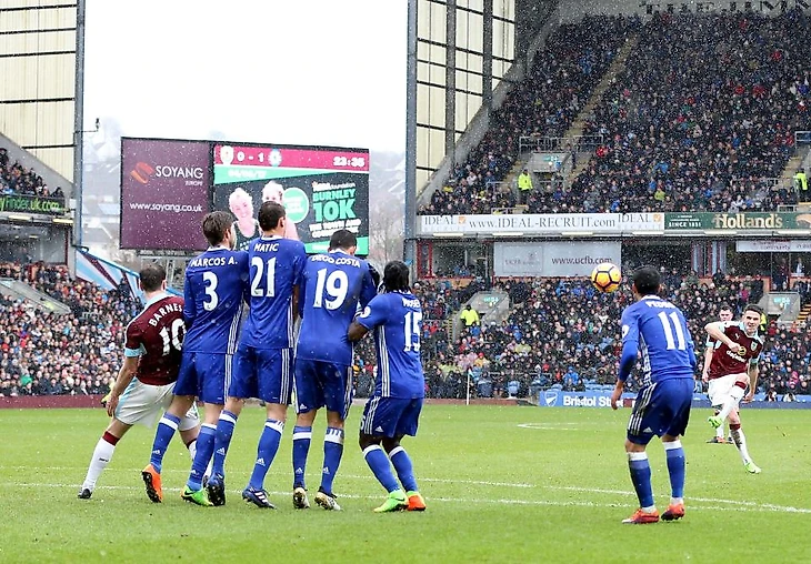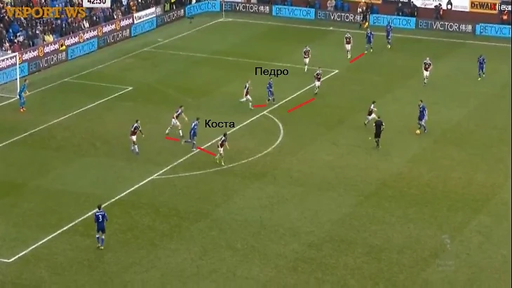 Как уже стало ясно, игроки отдали и фланги, и центр поля, а также не стали пытаться отобрать мяч у вездесущего Азара. За счет этого, расположение «бордовых» оставалось статичным на протяжении всего матча. Сегодняшний оборонительный рисунок «Бернли» выглядел как четыре центральных защитника с двумя латералями. Очень глубоко опускались крайние полузащитники. Близко к защитникам располагалась опорная зона, осознанно отдавая центр поля, но перегружая штрафную площадь. Так, передачи Азара не доходили до Педро и Диего Косты, а пространства для попыток пойти в дриблинг не было.