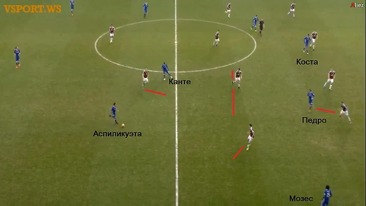 Здесь два игрока прессингуют Азара, сместившегося на фланг, и заставляют отдать пас на Косту или Алонсо, которых, якобы, опекают по одному игроку. Но в случае передачи на Алонсо, помимо Джорджа Бойда, на него переключается и Мэттью Лоутон, а в случае с Костой, на помощь Майклу Кину способны прийти либо Джоуи Бартон, либо Бен Ми