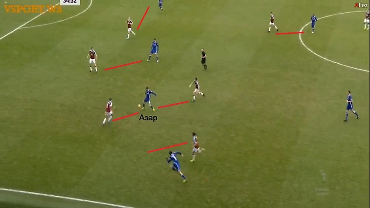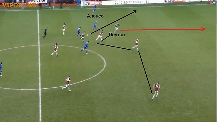 Азар отдает опережающий на Алонсо, но Мэтью Лоутон не бежит прессинговать, а остается на полуфланге. Несколько секунд спустя, он заблокирует прострел испанца