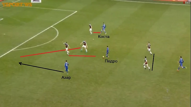 Педро обостряет на Азара, Лоутон остается в центре, а Бен Ми смещается в штрафную по диагонали вправо, где не дает бельгийцу пойти в дриблинг и совершает отбор