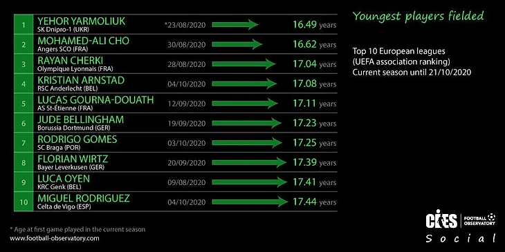 Самым молодым является Егор Ярмолюк из "Днепра-1", а следом идут Мохамед-Али Шо из "Анже" и Райан Шерки из "Лиона", одному из которых еще нет 17, а второму - только-только исполнилось.