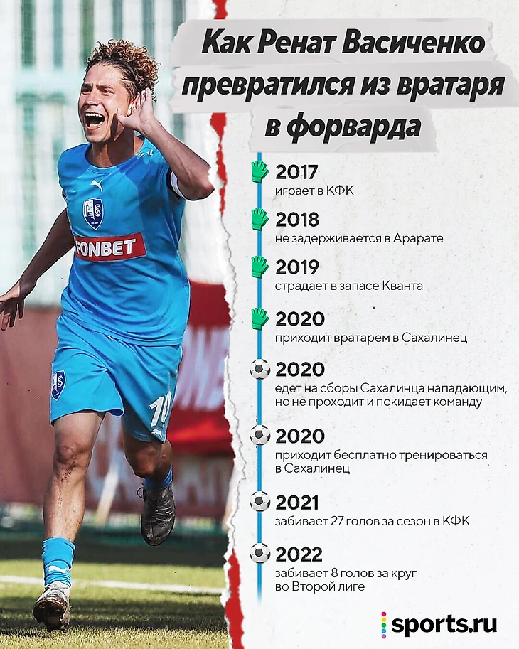 Вроде бы обычная статистика для нападающего, но есть нюанс. Ренат стал форвардом только пару лет назад, а до 22 лет был вратарем. Закончил школу ФШМ «Торпедо», но из-за роста 173 сантиметра никому не пригодился.