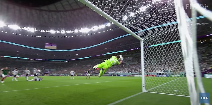Или матч с Мексикой. Это опасный штрафной при счете 0:0, когда Аргентина легко могла вылететь. Мартинес вообще не колебался – с риском ловить или без риска переводить на угловой.