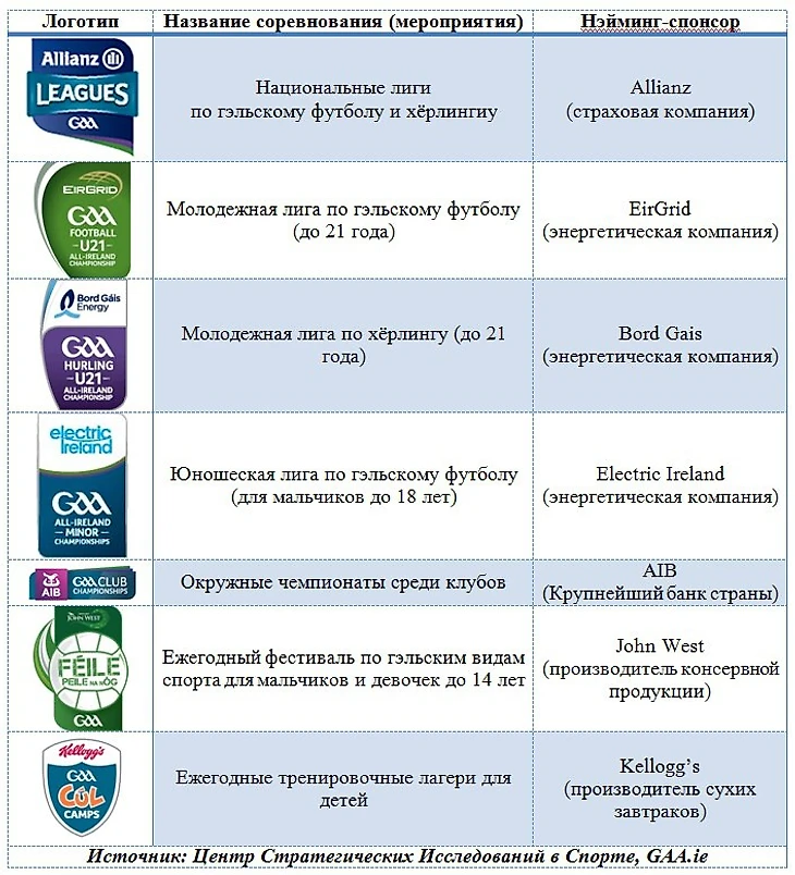 Межокружные турниры GAA по гэльскому футболу и хёрлингу имеют международные телевизионные контракты с BBC, Sky Sports, Premium Sports (для Северной Америки). Национальные лиги по гэльскому футболу и хёрлингу более чем успешно реализуют собственные нэйминг-права (эксклюзивное право на фирменное наименование мероприятия), имея контракт со всем известной страховой компанией Allianz. Причем в 2018-м их партнерские отношения отметя 15-летний юбилей. Нэйминг-права также успешно реализованы молодежными и юношескими соревнованиями. Завсегдатай наших завтраков, производитель сухих хлопьев Kellogg’s ежегодно спонсирует летние лагеря для детей до 12 лет по гэльским видам спорта по всей Ирландии. В 2016 году в них приняло участие порядка 127 000 детей, что значит, что каждый 10-й ребенок в стране участвовал в спортивных лагерях GAA.