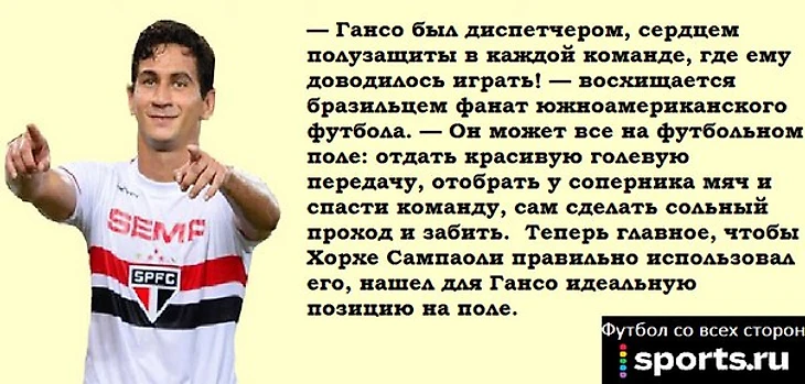 Сам Хорхе Сампаоли заявил, что собирается сделать из Гансо «бразильского Пирло», то есть поставить на позицию опорника рядом с ярко-выраженным футболистом оборонительного плана (Краневиттер, Н’Зонзи) и использовать его главное качество: отличное видение игры и умение сделать пас в нужный момент. Подробнее о плюсах и минусах этого игрока далее.