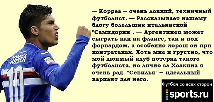 Перейдя в не самый приметный клуб Италии Корреа своей игрой добился интереса со стороны топ-клубов и вошел по итогам этого сезона в олимпийскую сборную Аргентины, так что уже в начале августа мы вероятно увидем этого футболиста на полях в Бразилии, где, напомним, сборная Аргентины сыграет с Португалией, Гондурасом и Алжиром.