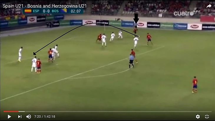 Как мы видим, итальянец в первые 45 минут за «рохибланкос» играл правого центрхава. Схему напоминает 4-1-4-1, где четверо игроков полузащиты (включая фланговых) нацелены на атаку, а один на защиту. Такое место вполне подходит Васкесу, так как на нем он может проявить все свои сильные качества: хороший пас, сольный проход, агрессивный отбор.