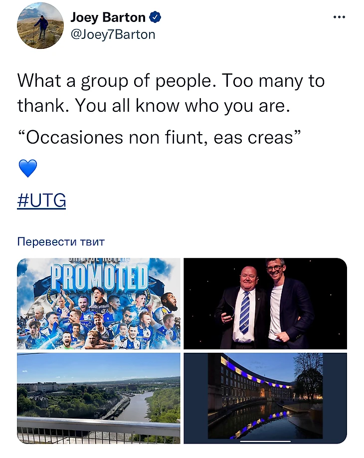 Но я вижу в этом проекте не только яркий результат, но и возможность построить красивый, умный, комбинационный футбол. Насколько я понимаю, Бартон с этим неплохо справляется, хотя возможности смотреть третий, а тем более четвёртый дивизион нет. Вернее она есть, если очень постараться, но всё-таки это очень специфическое зрелище. Кстати, Джоуи является не только тренером и хулиганом, но и философом. В вышеупомянутом подкасте доктор Лукомский сказал о том, что ещё на заре твиттера Бартон цитировал там Ницше. Да и сейчас там можно найти интересные высказывания, например: «You all know who are you are» (Вы все знаете, кто вы такие) и «Occasiones non fiunt, eas creas». Этот твит посвящен выходу команды Бартона в третий дивизон.
