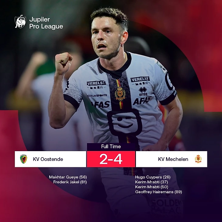 Хотя «Остенде» оказал сопротивление в первом тайме, «Мехелен» смог довести счет до разгромного, забив дважды до перерыва и еще раз – сразу после. А во втором тайме благодаря тренерским решениям в игру включился «Остенде» – и чуть не совершил эпичный камбек. Но вместо 3:3 на табло загорелся счет 2:4. На исходе основного времени Хайреманс восстановил отрыв в два мяча. Несмотря на непростой второй тайм, главный тренер «Мехелена» Ваутер Вранкен считает победу заслуженной: «Да, мы позволили «Остенде» войти в игру, но в целом только одна команда действительно хотела играть в футбол». Такого же мнения придерживается вингер Никола Сторм: «Мы пытались комбинировать, а «Остенде» просто забрасывал мячи на двух высоких нападающих. У нас отличная серия – надеюсь, она прервется нескоро». После разгрома от «Андерлехта» со счетом 2:7 «Мехелен» собрался и уже шесть туров подряд провел без поражений (пять побед, одна ничья).